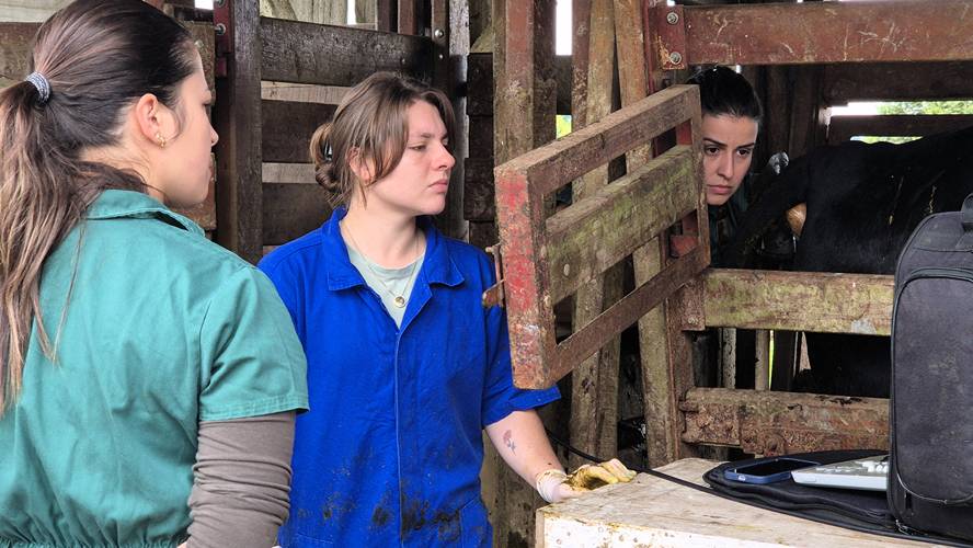 “Faz dois anos que existe esta parceria entre a Epagri e o Laboratório de Reprodução do CAV. Neste contexto, nós fazemos todo o manejo reprodutivo, os protocolos de inseminação artificial e os diagnósticos de gestação no rebanho bovino. Isso faz com que a gente traga os alunos para cá e possibilite esta vivência deles com o campo e as atividades em grandes animais. É um grande crescimento para a prática dos estudantes”, conclui a professora Verônica Scheeren, do curso de Medicina Veterinária do CAV Udesc.