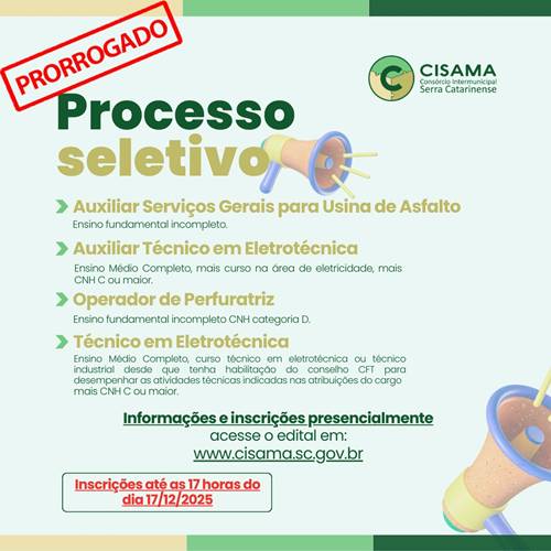 O Consórcio Intermunicipal Serra Catarinense (Cisama) prorrogou o prazo de inscrições do Processo Seletivo destinado ao preenchimento de vagas temporárias no quadro de pessoal da instituição. Inicialmente previstas para encerrar às 17h desta sexta-feira (12), as inscrições agora seguem abertas até quarta-feira, 17 de dezembro, conforme o Edital de Processo Seletivo nº 002/2025.