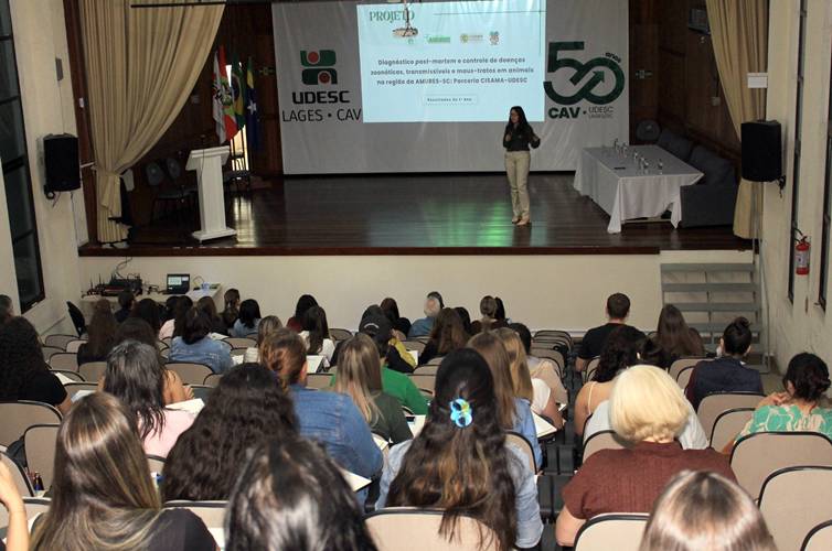 A primeira palestra foi ministrada pela doutora em Ciências Veterinárias, Renata Assis Casagrande, professora da Universidade do Estado de Santa Catarina (Udesc Lages), com ampla experiência em patologia animal, aviária e de animais silvestres. Ela abordou o tema “Diagnóstico post-mortem e controle de doenças zoonóticas, transmissíveis e maus-tratos em animais na região da Amures”.