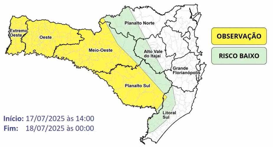 Há risco de destelhamentos, danos na rede elétrica e queda de galhos. As instabilidades atingem as regiões de divisa com o Rio Grande do Sul entre a madrugada e manhã e avançam para as demais áreas do estado ao longo do dia.
