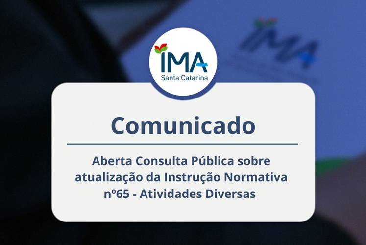 O Instituto do Meio Ambiente de Santa Catarina (IMA) comunica abertura de prazo até dia 7 de novembro de 2025 para recebimento de sugestões e comentários sobre a proposta de atualização da Instrução Normativa (IN) 65 – Atividades Diversas. A IN-65 apresenta a documentação, incluindo estudos, projetos, planos e programas ambientais a serem apresentados para o licenciamento ambiental de atividades ou empreendimentos que não possuem uma Instrução Normativa específica, tendo, assim, caráter mais generalista.