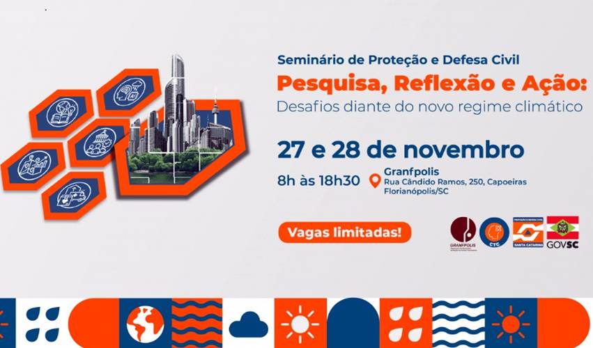 A Secretaria da Proteção e Defesa Civil de Santa Catarina (SPDC/SC) realiza, nos dias 27 e 28 de novembro, o Seminário de Proteção e Defesa Civil – Pesquisa, Reflexão e Ação: Desafios diante do novo regime climático, em Florianópolis. O evento, organizado em parceria com a Granfpolis e com apoio da Fepese, reunirá especialistas, acadêmicos e gestores públicos de referência nacional para dois dias de debates, palestras e oficinas sobre os impactos das transformações climáticas na gestão de riscos e desastres.
