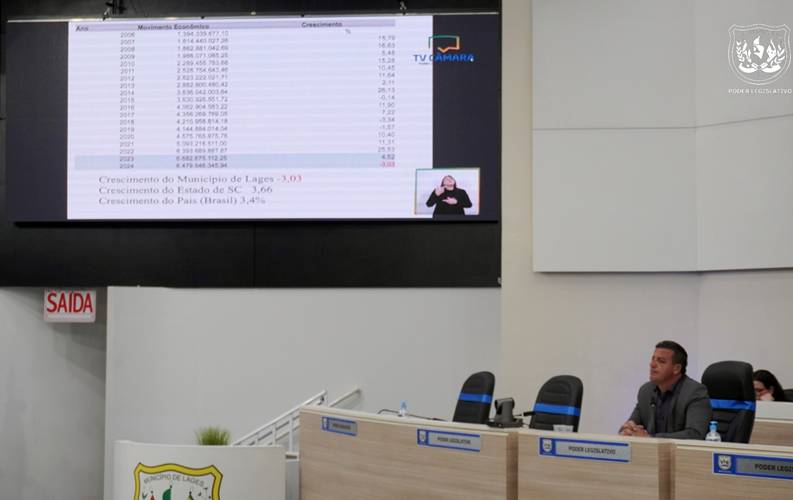 A reunião foi conduzida por Cleino Arruda de Souza, controlador Interno da Câmara Municipal, que apontou que o Produto Interno Bruto (PIB) de Lages, ou seja, a soma de todos os bens e serviços produzidos no município em 2024 foi de R$ 6.479.546.345,94, o que representa um decréscimo de 3,03% em relação ao movimento econômico apresentado em 2023. O percentual abaixo em comparação ao ano anterior pode ser explicado por ser o último exercício da gestão anterior, quando geralmente há um maior controle dos gastos públicos.