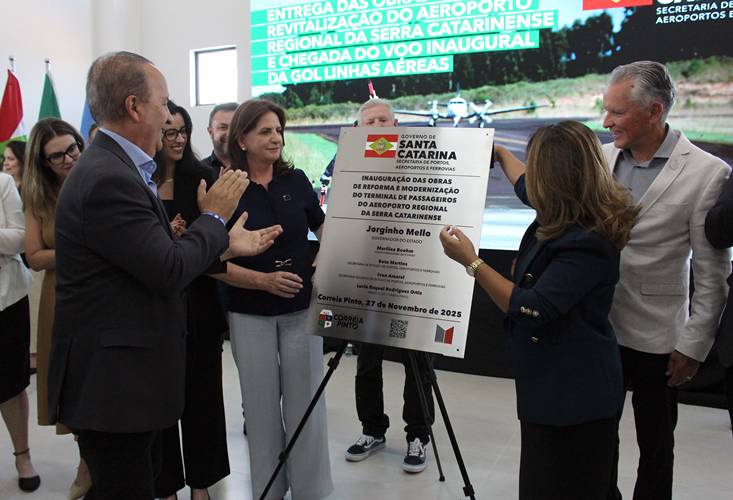 O governador Jorginho Mello inaugurou nesta quinta-feira, 27, as obras de revitalização do Terminal de Passageiros do Aeroporto da Serra Catarinense – Correia Pinto e recebeu o voo inaugural da GOL Linhas Aéreas. Esta nova conexão marca a retomada de voos no aeroporto, após uma negociação direta do Governo do Estado, via Secretaria de Portos, Aeroportos e Ferrovias (SPAF).
